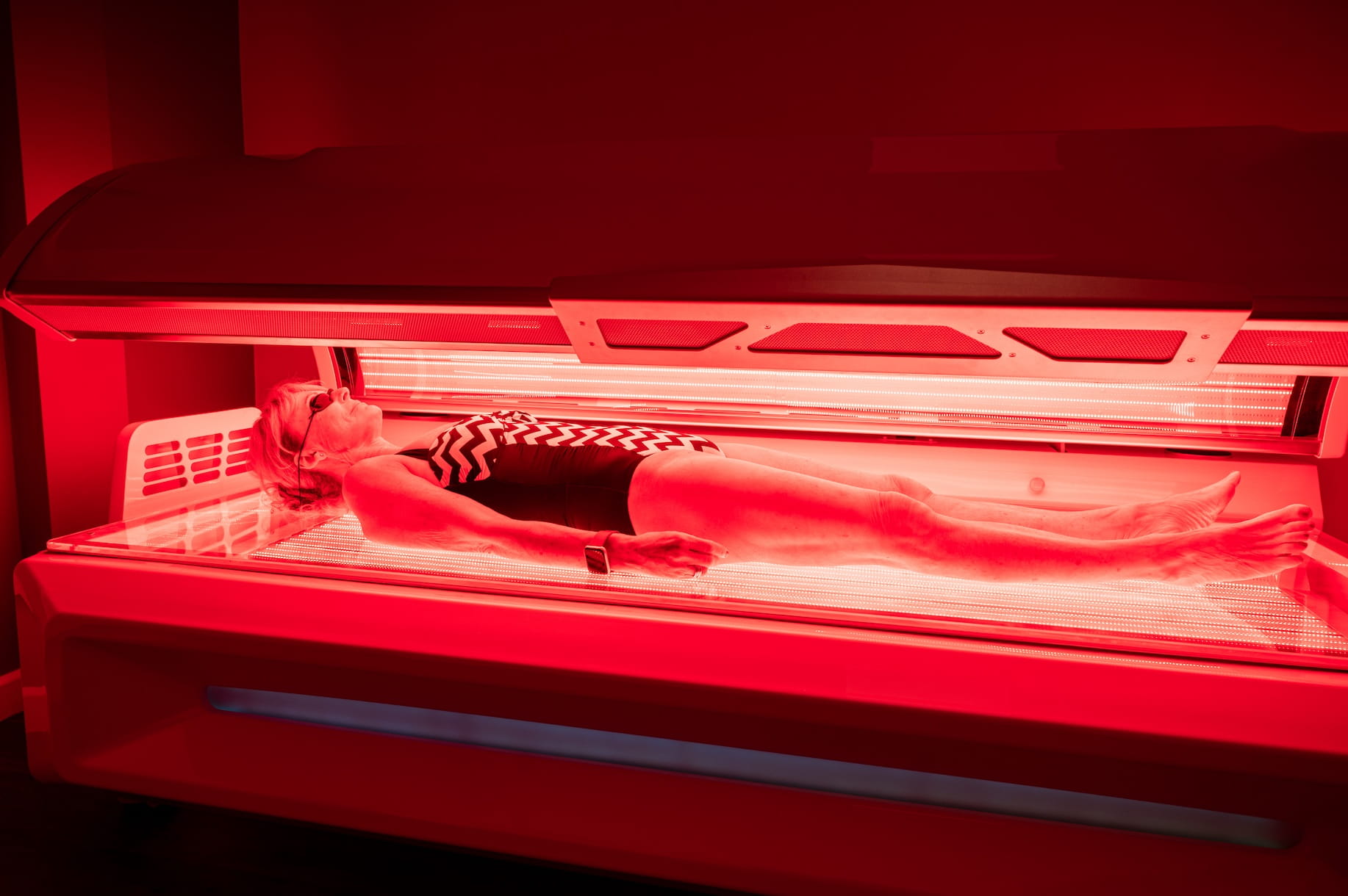 Some of our studios have a Medibed commercial full body red light therapy bed with 32,000 LED’s having a combined output of 5800 watts providing red or near red light in 630nm, 660nm, 810nm, 850nm and 940nm wavelengths during each 15-minute session.